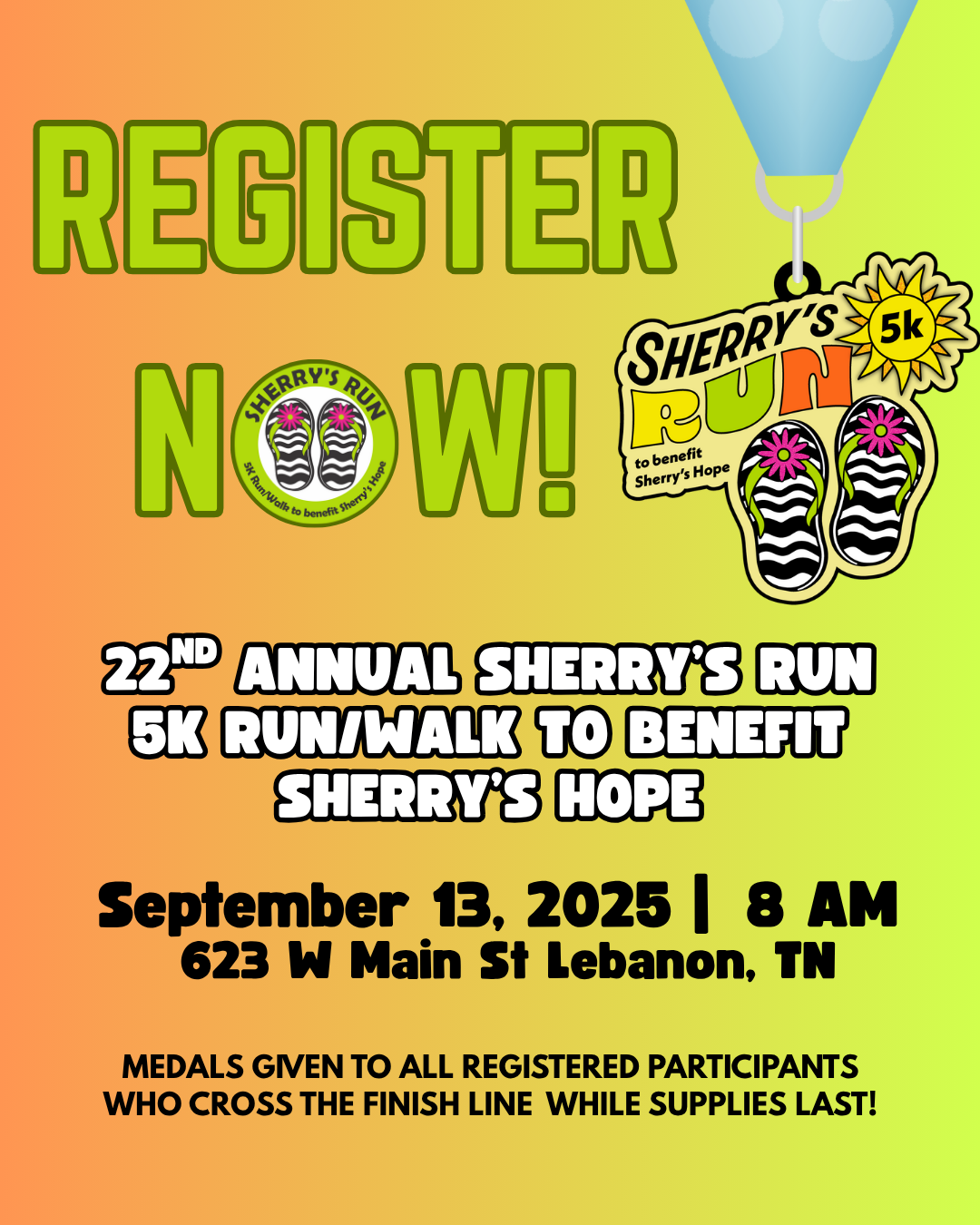 Registration is now open! The team at Sherry’s Hope is thrilled to officially announce the 22nd annual Sherry’s Run 5K Run/Walk, happening on Saturday, September 13, 2025. Please make plans to join us as we come together with heart and purpose to uplift and support those in our community who are walking through some of life’s most difficult seasons.