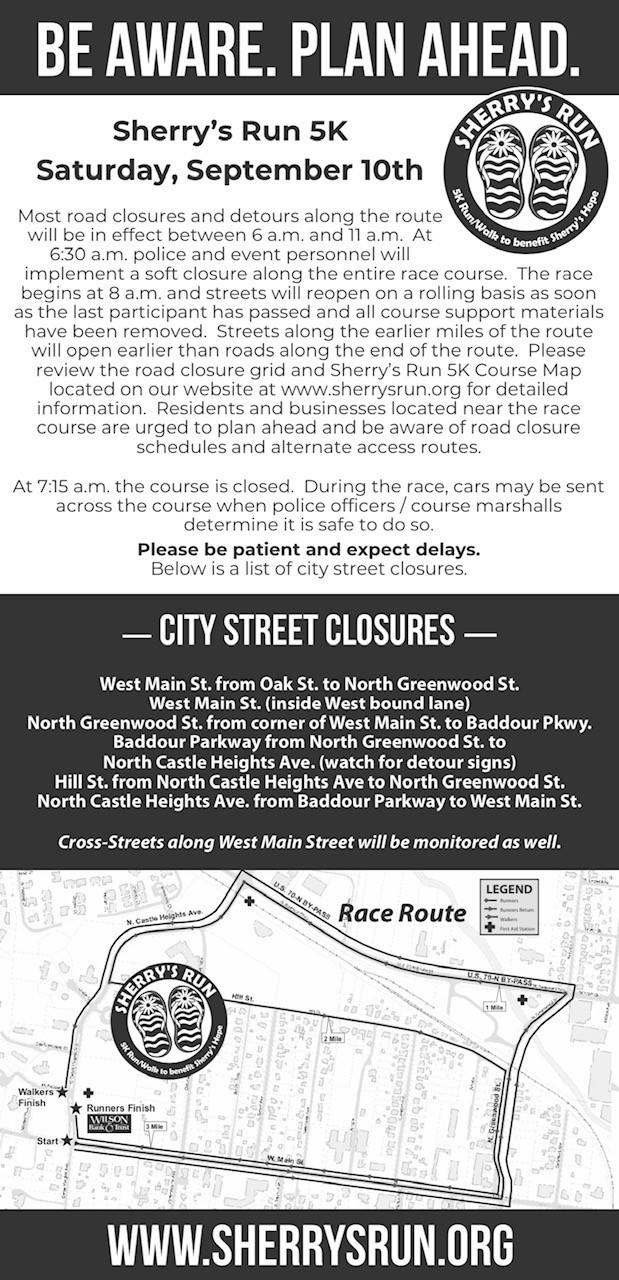 Sherry’s Hope announces road closures for the 19th Annual Sherry’s Run 5K Event on Saturday, September 10, 2022.