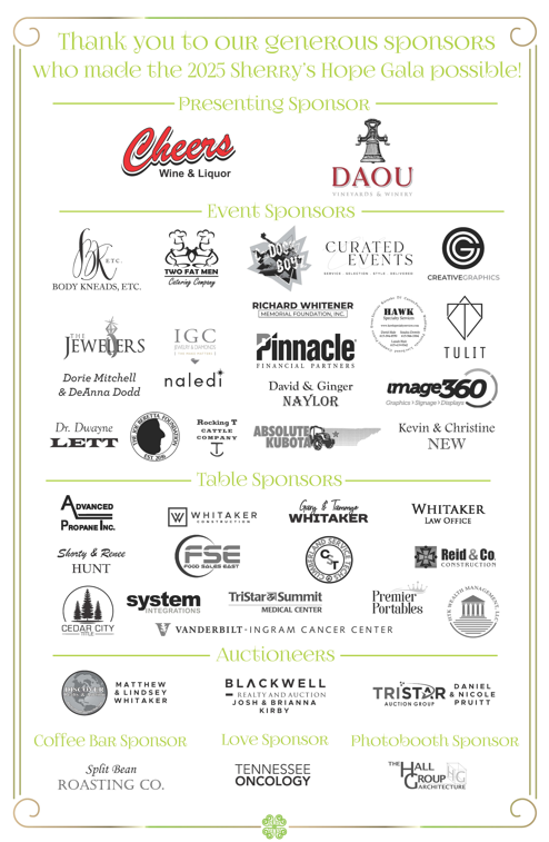 Sherry’s Hope would like to thank Presenting Sponsor and Cocktail Hour Host, Cheers Wine and Liquor! Other event sponsors who made the night a success include DAOU Vineyards, Two Fat Men Catering, Body Kneads, Etc., The C-Dock Boyz, Hawk Specialty Services, Creative Graphics, Curated Events, Dorie Mitchell & Deanna Dodd, Image 360, The Joe Beretta Heart Foundation, Pinnacle Financial Partners, The Richard Whitener Foundation, The Jewelers / IGC Naledi, Tulit Investments GP, David & Ginger Naylor, Kevin & Christine New, Dr. Dwayne Lett, Absolute Kubota of Lebanon, and Rocking T Cattle Company. Thank you to our Love Sponsor, Tennessee Oncology. And finally, thank you to all of our amazing attendees and Table Sponsors: Advanced Propane, Inc., Whitaker Construction, Whitaker Law Office, Cumberland Service Techs, Shorty & Renee Hunt, Food Sales East, Gary & Tammye Whitaker, Reid & Co. Construction, TriStar Summit Medical Center, Premier Portables, HTK Wealth Management, Vanderbilt Ingram Cancer Center, Cedar City Title, and System Integrations-Jeff and Melinda Ledford.